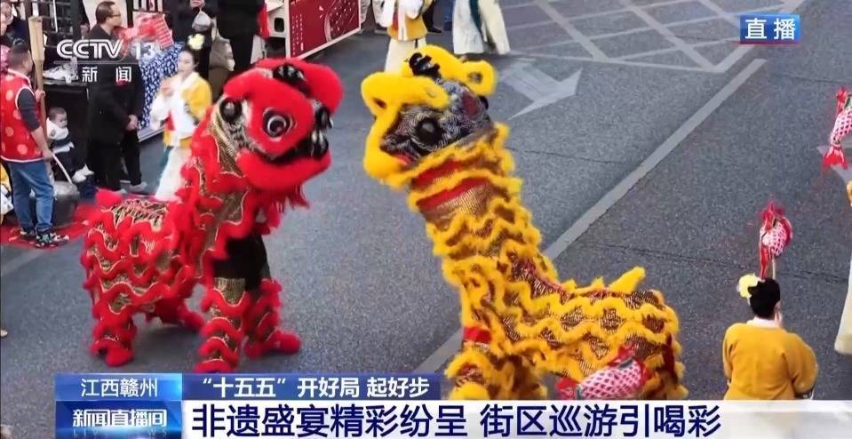 r除了特色商铺,最吸引人的要数精彩的客家非遗展演活动。舞狮队和鲤鱼灯正在街区巡游,十余名表演者默契配合,寓意“年年有余”的鲤鱼灯在空中翻腾起舞,栩栩如生的雄狮不时向观众眨眼示意,引来阵阵喝彩。