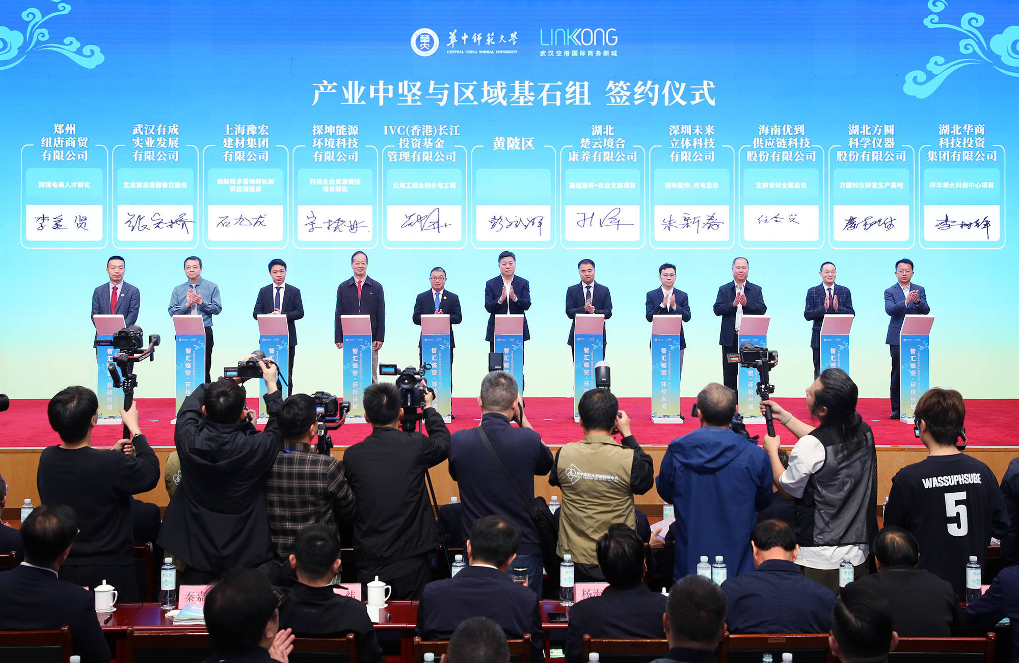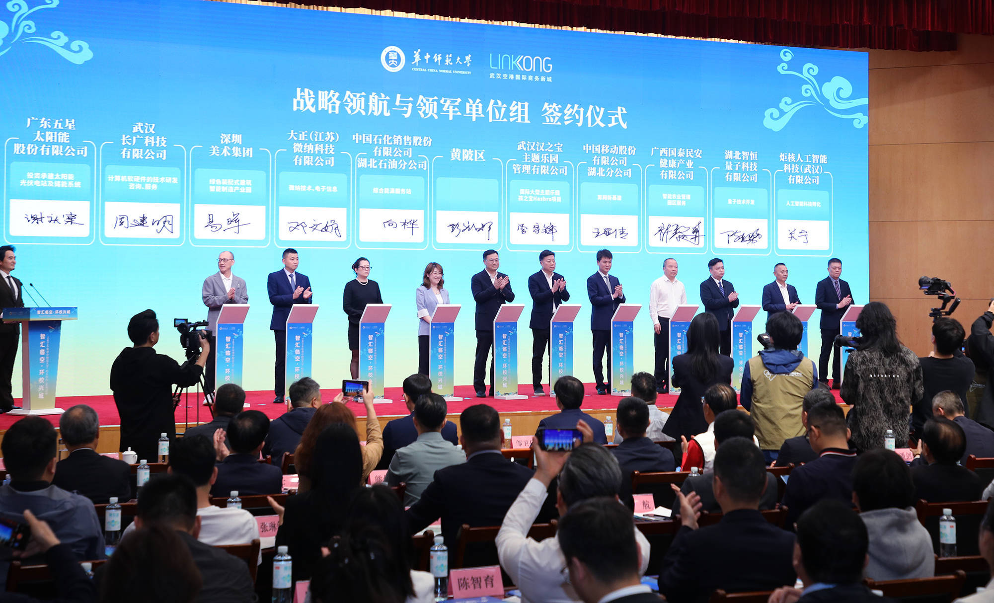 武汉市人民政府副市长李湛;华中师范大学党委书记夏立新,华中师范大学校长彭双阶,华南师范大学原校长王恩科,华中师范大学副校长刘宏达;武汉市委组织部,武汉市人才工作局,武汉市投资促进中心,中国农业银行湖北省分行、湖北文化旅游集团相关负责人;黄陂区委书记何建文,区人民政府区长张劲,区人大常委会主任陈军,区政协主席熊定萍;武汉城投集团总经理盛华,武汉城投集团总经济师、临空投党委书记、董事长周强参加会议。