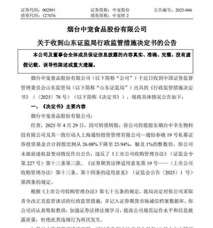 2025年10月22日,中宠股份披露收到山东证监局行政监管措施决定书,控股股东及一致行动人因可转债转股引发持股比例变动触及1%整数倍,未按规定履行信息披露义务,公司被采取责令改正及监管谈话措施,相关违规情况被记入证券期货市场诚信档案。